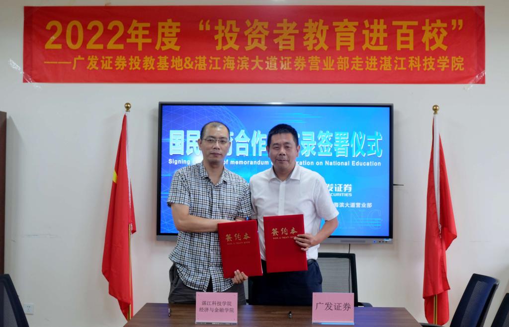 为进一步推进校企合作,深入落实“投资者教育进百校”活动,近日,我校经济与金融学院和广发证券湛江海滨大道营业部在新湖校区举办国民教育合作备忘录签署仪式。出席本次签约仪式的有经济与金融学院院长张力、党委书记邓晓开和骨干教师们,以及广发证券粤西分公司总经理助理、湛江海滨大道证券营业部总经理陈显任等有关领导。